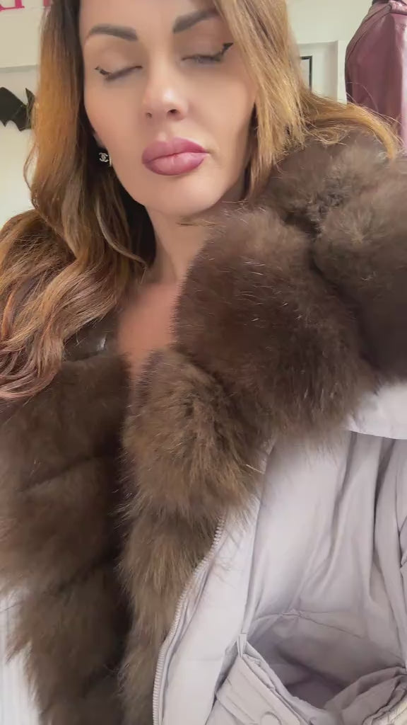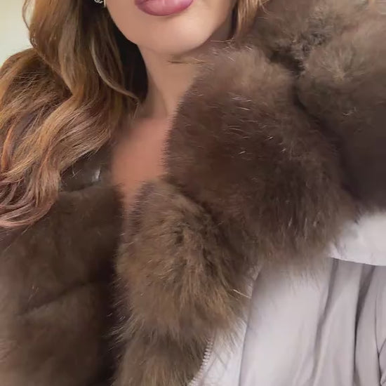 Lilac Short Puffer Jacket with Fox Fur Collar